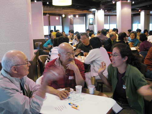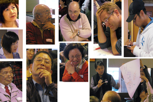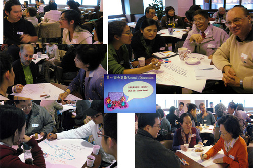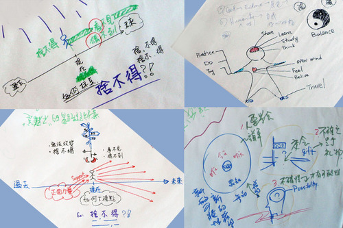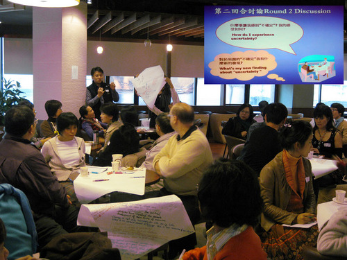 經過這麼兩回合的討論,我邊攝影邊觀察,發現World Cafe的魅力,就在於把與會的人拆成四到五人的小組,有些人也許不善於在一群人面前講話,但這時面對的是一個小組,就像跟一小群同事聊天一樣,反而較能勇敢發言。