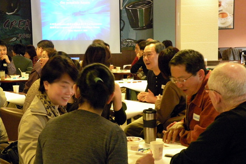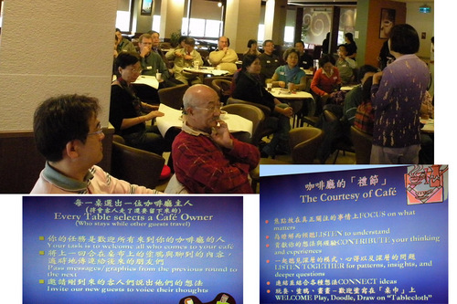 1:00前,與會者陸續前來報到,這次有60多人參加這時下正夯的對談方式,World Café使用咖啡館的環境創造人們能交談的一個溫暖、邀請的情境,參加者非正式地聚集在小桌和被鼓勵交談、分享、探索和learnings,Café交談是帶領合作對話,分享知識,能開放新的可能性和能量。