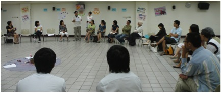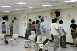 9/27 第一場有關88水災的開放空間會議啟動了.除了主辦單位與共同推動者外,參與者分別來自於企業界、非營利機構、-,社區大學、台灣原住民族文化產業發展協會、綠色連線協會、綠黨、台灣公益團體自律聯盟、大葉大學空間設計的大學生, 其他個人工作者-顧問、引導師,退休老師等。35人坐在圓圈內,由引導師帶領進行。短短20分鐘內,空白的牆上貼了10幾個議題。開放空間會議是『有機』會議,因為參與者不同,議題的範疇不同,討論的動態也自有其生命力。每個人憑自己的關心點選擇小組進行熱烈的討論。經過三個時段的討論,我們閱覽牆上滿滿的紀錄,專心的找出可能行動的機會。大家似乎不想只談談了事,真的想要有後續的行動,於是了有八個行動領域誕生。