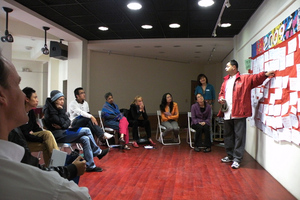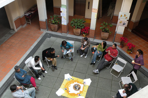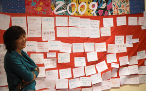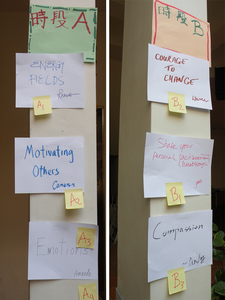 Beginning with a meditation led by Warren Carey, we focused our mind and energy on the present moment and rekindled our intuition through “Qi”-based exercises. Next, Jorie Wu invited us all to construct a “wall of wonder”, a tool that can use with oneself, one’s family or community/company. In this instance each person wrote down key events that highlight 2009 for him/her. These slips of paper were then categorized into the domains of World, Taiwan and Personal. In assembling each or individual memories we constructed our collective memory and interesting patterns emerged. Names of environmental disasters peppered the wall, along with notes on turning points in the passing of life such as graduation, sickness, wellness, the coming apart and coming together phenomena of life. From this bird’s eye view we could better perceive the patterns of connection, the “ripple effect”, and two profound insights emerged: “be more mindful!” and “there is always a way to help”.