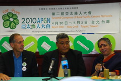 APGN第二天議程今(1)日於天母國際會議中心大禮堂展開,印度知名生態運動者席娃親臨會場致詞。澳洲綠黨參議員鮑伯.布朗(Bob Brown)介紹席娃的主張是:「兼顧全球視野以及人性,主張人類應該與地球和諧共存,而非利用破壞」。
