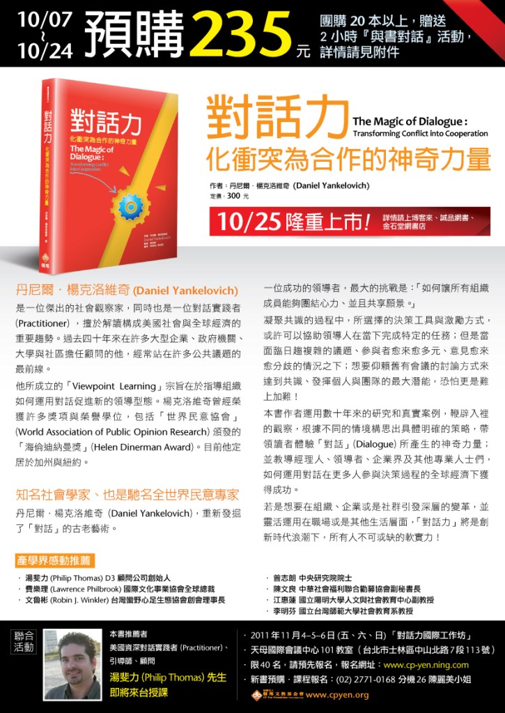 在這個【對話力國際工作坊】中,我們特別邀請到在許多國際組織、非營利組織,以及許多國際上重要的對話與組織變革議題與訓練工作上極富盛名的Philip Thomas (湯菲力) 先生來台,不僅為大家帶來最新的結合利益相關者的策略規劃的方法,也帶來一些實用工具、演練及案例研討。過程中將結合參加者本身的經驗與知識,也提供足夠的時間作彼此的互動與個人反思。