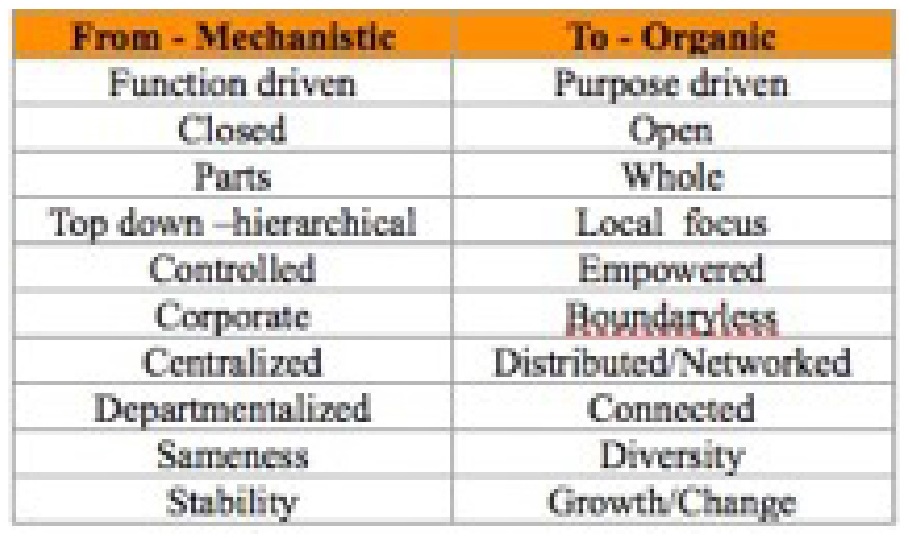 A significant shift in thinking in the knowledge age is the use of biological metaphors rather than machine metaphors. There is a focus on the whole and the connection of the parts rather than on the parts alone. From our industrial age roots, organizations were thought to have clear boundaries and assumed an authoritarian, hierarchical pyramid like organizational structure. This was effective for the time since the need for responding to change was not as immediate. Since access to information was not easy nor was the workforce as educated, decision making was concentrated at the top. This authoritarian hierarchical model provided clarity, consistency, and control.