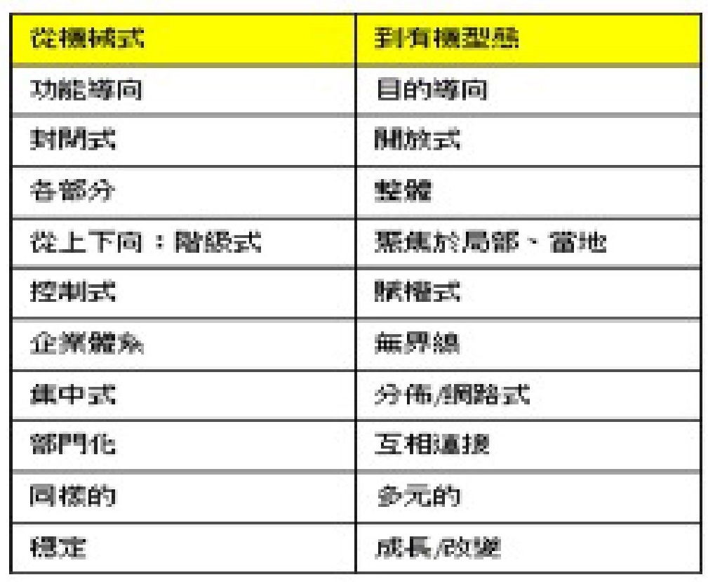知識時代之中,思考的模式出現一個很重要的變化,就是生物的隱喻取代了機械的隱喻。焦點凝聚於整體的狀況、不同元件之間的關聯性,而不是逐一檢視不同的個體。過去在工業時期,大家普遍的認知就是組織會有明確的框架結構,自然會形成一個權威式、如金字塔式的組織階級結構。這樣的做法在當時相當有效果,可以回應非即時性的變化,畢竟當時資訊較不發達、勞工的教育程度有限,所以決策的過程主要是由高級主管來負責。這樣的權威式階級模式很清楚、一致、有掌控權。