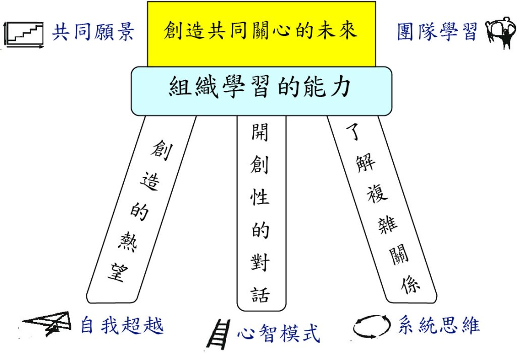 註:《第五項修練》中所指的五項修練是系統思維(systems thinking)、心智模式(mental model)、自我超越(personal mastery)、共同願景(shared vision)和團隊學習(team learning)。彼得聖吉說,若然《第五項修練》有機會重新名命,他會叫它做「三腳凳」,相信是因為五項修練的說法容易讓人覺得是五項不同的東西。而三腳凳比較容易讓人想像到三者缺一不可,這也避免了人們繼續不停地問什麼是「第」五項修練。