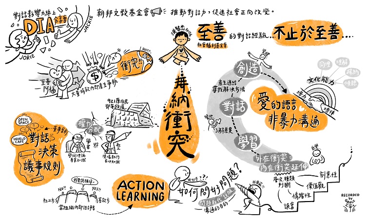洪智杰執行長20年來帶領至善經歷大大小小的摩擦與衝突,例如因募款造成資源分配的衝突、因假設與理念不同產生的衝突、董事與社工因知識與權力不對稱產生的衝突、部門之間因關注重點不同而產生的衝突等等。洪執行長表示,若要對症下藥解決衝突,最好先診斷衝突的類型,將衝突作出歸類後再逐步化解。衝突若出於誤會,只要在事實認定後就比較容易解決;如果是因為組織成員溝通習慣造成經常性的小矛盾就可能導致情緒上的衝突,就需要多花時間同理傾聽;更難處理的是理念僵持不下的價值觀衝突,可能就需要運用非暴力溝通的調停方法去找到解答;若是遇到結構性的衝突時,最好使用參與式的討論與決策方法,透過對話機制與議事規則,攤出來所有問題的根源並且達成合議與行動決議,促進彼此瞭解。