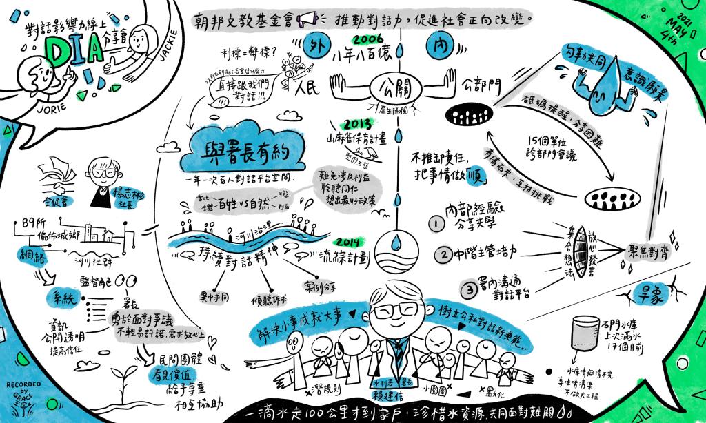 「清淤泥就像拖地板,拖地板的家人平時你不會覺得重要,但當他不在的時候,你會覺得他變得很重要」署長說。今年台灣遭逢五十六年來最嚴重的乾旱問題,也顯示出氣候變遷的問題已迫在眉睫,水利署長久以來在台灣水資源的政策與推展上默默的努力,也透過各種的溝通管道大聲疾呼大家珍惜水資源,並且清除永無止境的淤泥與淨化水源,這些已成例行性的水資源工作,就像大禹治水,無法以一己之力,而是需要集眾人之智與眾人之力才能完成。這些沒有打鬥只有真誠對話,解決問題的會議,絕不會在媒體上出現,然而許多問題輪廓就是在無數次的反覆討論中逐漸清晰,出席會議者也是抱持善意行動參與,就算有不同的意見也會提出替代方案。無論是內部或外部的會議,我們都看到水利署將對話的重要元素融入在組織文化中,為捍衛台灣的水資源而努力,期待下一場「與署長有約」的真誠對話!