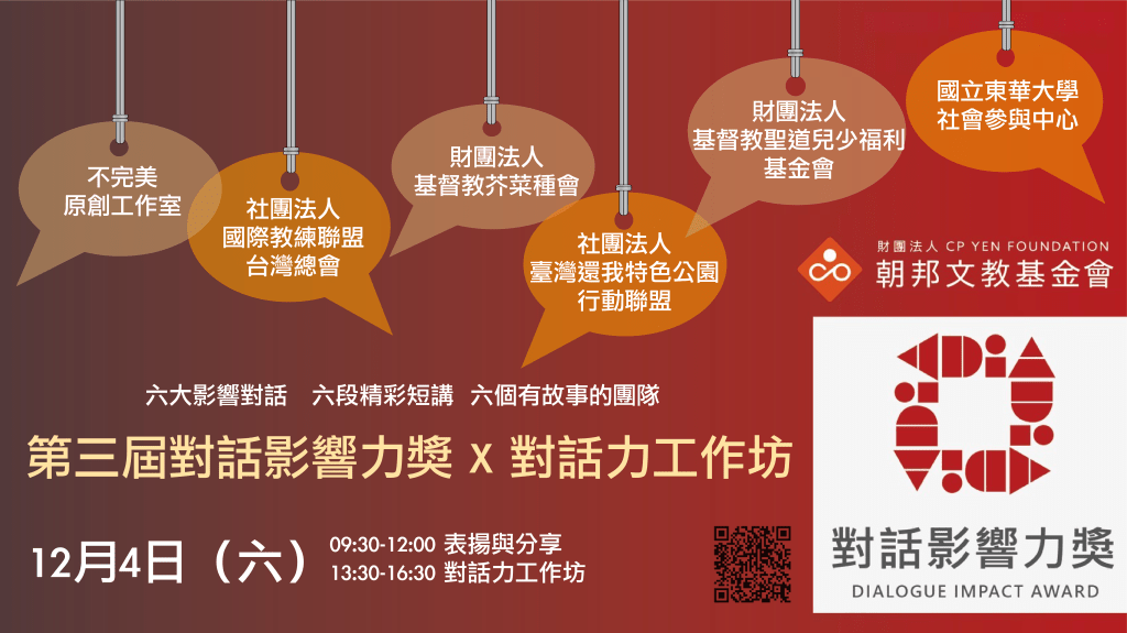 今年的「對話影響力獎」共有六個單位得獎,讓我們看見到在社會各個角落許多精彩的對話結果,在頒獎典禮當天除了將正式揭曉「對話影響力獎」金、銀、銅的得獎單位之外,也將有所有得獎者的分享短講,以及下午的公投對話體驗活動,我們相信這一年一度的對話日,因為有您的參與讓對話更豐富,因為有您的對話讓我們的世界更永續。