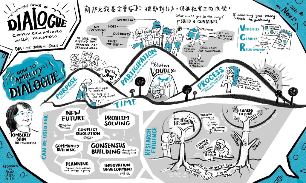 朝邦文教基金會於2021 年11月1日舉行的線上分享會《如何強化對話的力量How to Amplify the Power of Dialogue》,由知名引導師Kimberly Bain主講。她是一位極為資深的引導師,在過去數十年來,透過引導協助各種規模的團體達成共識。本季的新訊為各位報導分享會的精彩片段。(您可以在此更了解 Kim的背景與服務內容: https://www.baingroup.ca/about-us.html)