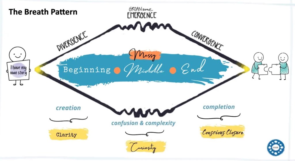 In her introduction Mary Alice used the image of listening through two angels, the participant or self and as a leader or facilitator. Facilitators can support groups and leaders develop their collective storytelling by designing processes that support their progression through the stages of divergent thinking, to insight emergence and ultimately to convergence towards actions that can move the group forward. Mary Alice introduced a tool for this process called the “Diamond of Participation”, also known as “the Breath Pattern” by the “Art of Hosting” community of practice.