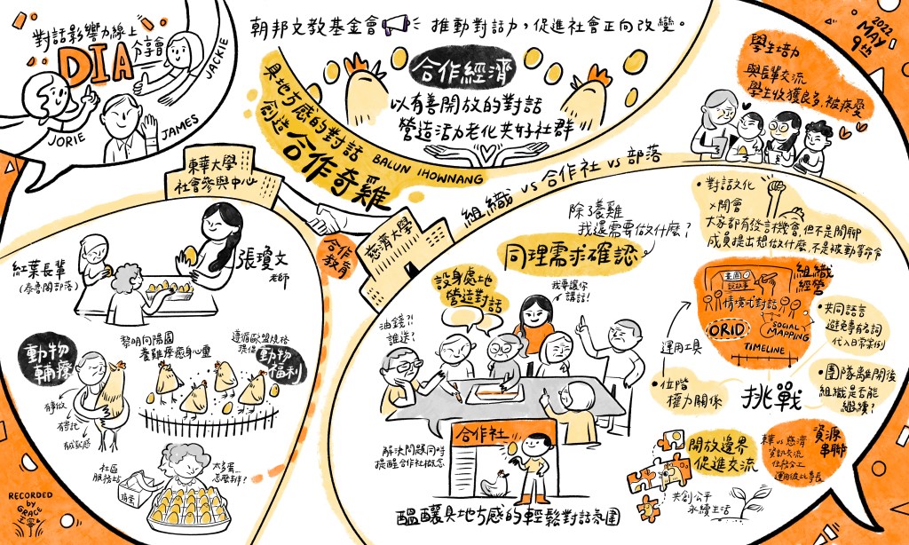 獲得第三屆對話影響力獎金牌獎的東華社參,透過非人的物種「蛋雞」,連結了部落長者、NGO組織、動物福利學者以及花蓮在地兩所大學,藉由以療癒為出發點而產出的「雞蛋」,協助部落建立經濟性合作社組織;當東華社參結束階段性任務,部落合作社仍持續運作的關鍵,東華大學社會參與中心組長暨合作經濟主軸教師張瓊文認為,正是對話的建立。