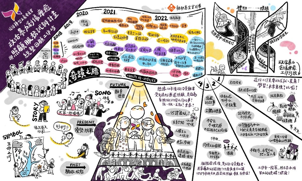 在引導師的協助下,各個工作團隊整理單位成立以來的大事紀,彙集為政治受難者及家屬照顧支持試辦計畫的「奇蹟之牆」。因服務對象特殊、過去政府部門缺乏政治受難者的服務經驗,多數助人者對政治暴力歷史很陌生,需要從頭學習,否則不容易聽懂受難者,也看不懂政治暴力的隱微創傷。位於領頭羊地位的促轉會重建社會信任組,在委託開辦據點服務之前,就先辦理培訓課程,並經過受難者及家屬的需求調查、試辦心理療癒「卸密」工作坊等,才委辦據點,並一路陪同據點一起學習成長;為回應受難者的個別需求,開辦「密集照顧方案」,透過個管員的評估及處遇計畫,將資源輸送給受難者家庭。台北據點整理的是,工作人員間如何從個別的工作人員凝聚為一個團隊的重大事件,政治受難工作是一個與深度創傷接觸的工作,個管員不能孤單地工作,因此團隊的建構是很重要的,作為每個個管員的支撐與力量。台中據點紀錄陪伴受難前輩的細緻服務軌跡,例如陪伴高前輩從不與外界接觸到開攝影展,並療癒了所有的參與者;又如個管員陪伴鍾前輩去投票時的細緻陪伴歷程,真摯動人。高雄據點則彙整了據點辦理的重要活動,每次出遊都在與受難者建立關係,也開啟長者間與外界的連結、相互的連結;長期辦理的戲劇工作坊更是讓長輩用戲劇方式療癒自我。台南據點定期辦理「講咱的故事,受難者的腳蹤」活動,讓受難者有一個自在的空間可以談白恐的歷史與經驗,並有傳承歷史給年輕人的重要意義。