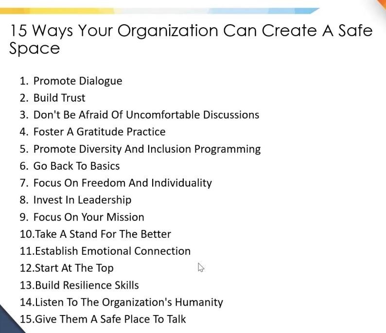 The principles applied in this case study comes from a Forbes magazine article titled “15 Ways Your Organization Can Create a Safe Space”.