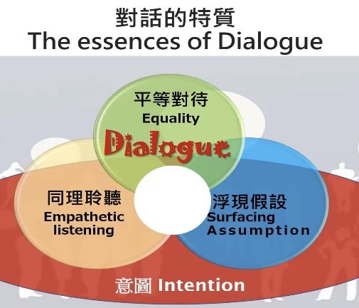 根據《對話的魔力:將衝突轉化為合作》一書(朝邦基金會出版),對話包含三個要素:平等待人(平等對待每個人)、同理聆聽和浮現假設(擱置自己的假設,以便有一個開放的心態,有意圖相互學習)。這三個元素相遇的中心 是白色的空間,是衝突可以轉化為對話的空間。“與大師對話”三月分享會的目的是探索這個對話空間並學習如何發展它。