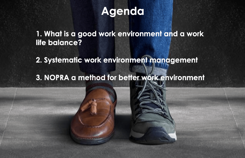 Good work environment management is both about limiting the risks and developing the factors for positive outcomes. Even if the goal is to prevent or reduce accidents and work-illnesses it also helps to systematically develop the social and organizational work environment. Here is one another way to categorize or the work environment including all working conditions: