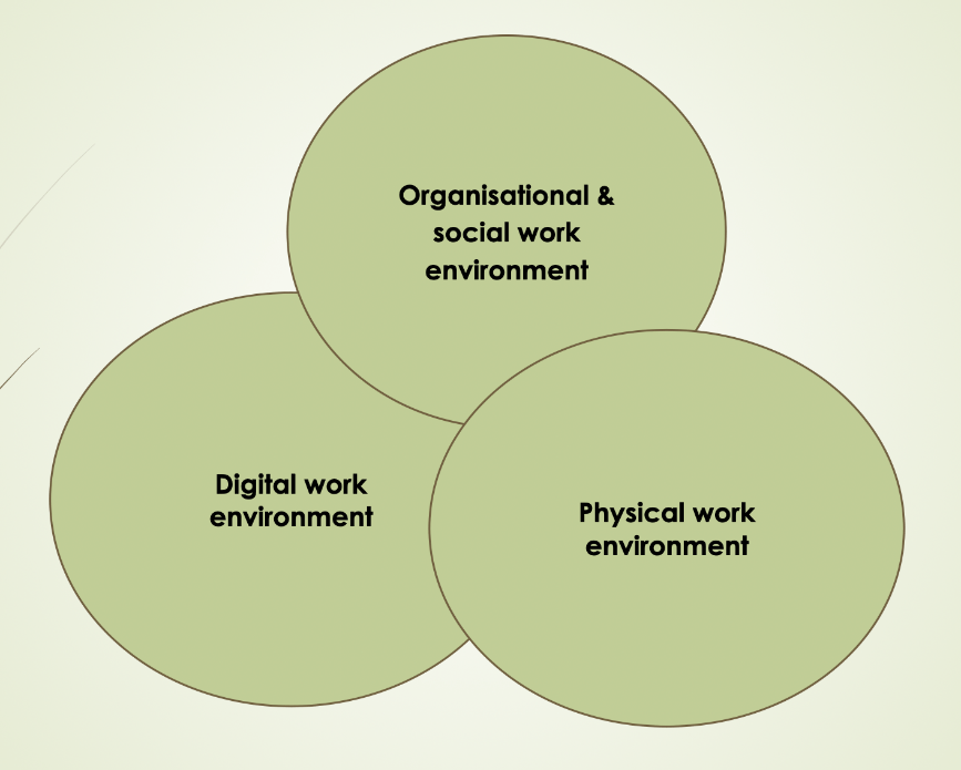 - The organizational work environment – how work is organized, controlled and communicated, as well as how decisions are made and how colleagues interact.