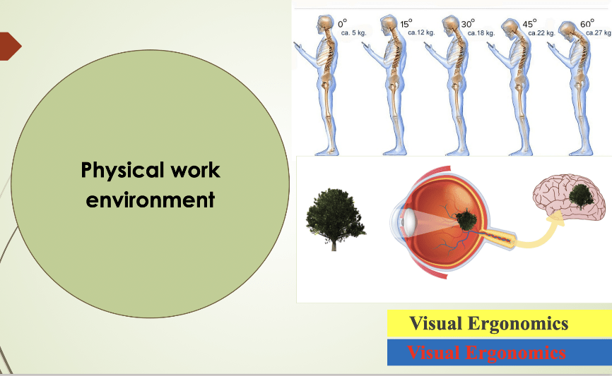 工作環境的社會性 – 我們如何與周圍的人互動並受其影響。 - The physical work environment – ergonomics, noise, ventilation, lightning facilities and tools to reduce risks.