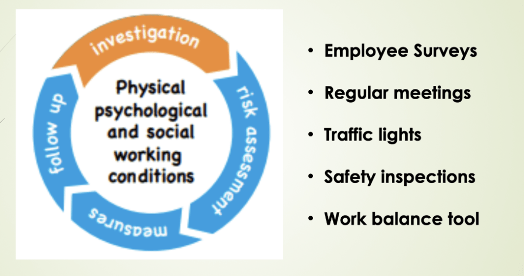 調查方法包括關於工作環境的調查,評估人體工學,噪音,照明等物理條件的安全檢查,以及定期舉行會議,評估工作環境是議程的一部分。