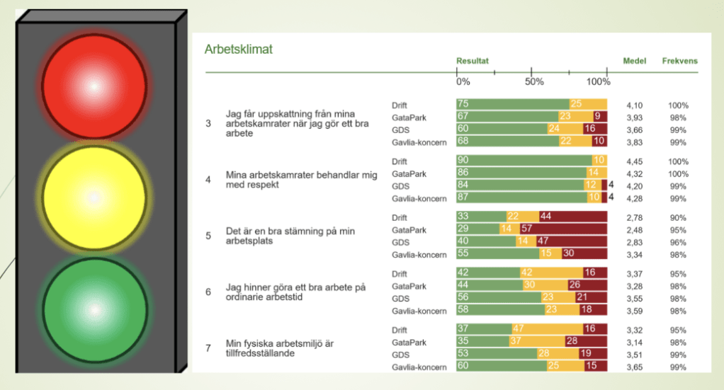A result of an anonymous employee survey could look like the horizontal bar chart on the right hand side of the image above. The length of each traffic light color represents the potential risks or dissatisfaction among employees.