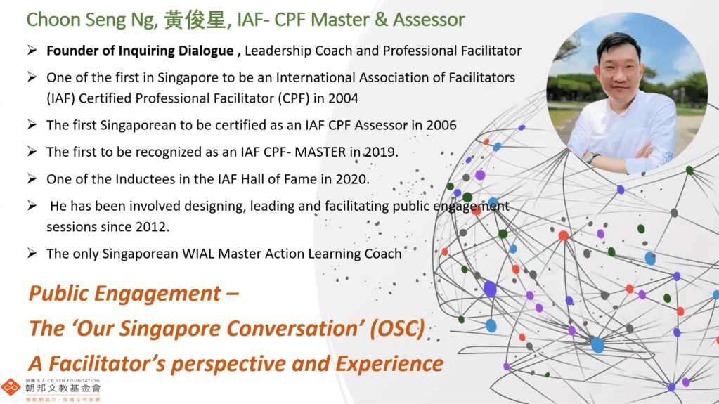 I, Choon Seng Ng, participated as a designer of the overall OSC engagement process. Our objective was to engage as many Singaporeans as possible from all walks of life to co-create the future based on average people’s aspirations rather than the Singaporean government deciding the future and requiring the nation to follow, which had been the Singaporean way of governance for many years. From the start, we understood that this OSC dialogue would be an ongoing work in progress for the government, and is not a short-term event.