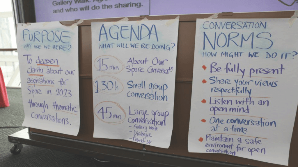 Phase Two focused on some of these topics and was a convergence process. At a typical dialogue session 30-50 people would show up at the venue at the advertised time. The process flow starts with a discussion in a large group, followed by discussions in smaller focus groups, and finally reflective discussion as a large group. The image below was drawn by a graphic recorder named Wendy Wong who captured key insights of the citizen dialogue into an artefact reflecting the group’s collective thought.