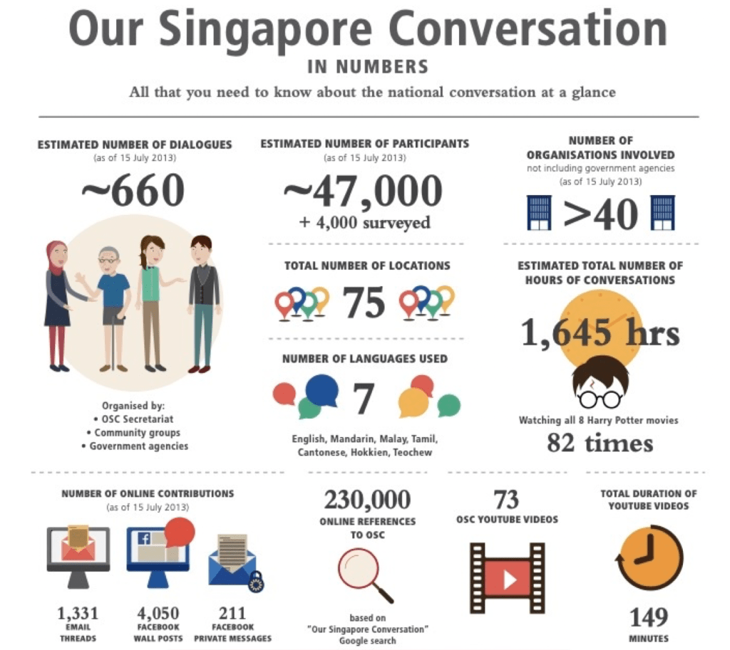 In the OSC engagement process, we held 650 dialogue sessions with about 47,000 people in face-to-face meetings over one year, amounting to about 1,645 hours of conversations in 7 languages: English, Mandarin, Malay, Tamil, Cantonese, Hokkien and Daiju.
