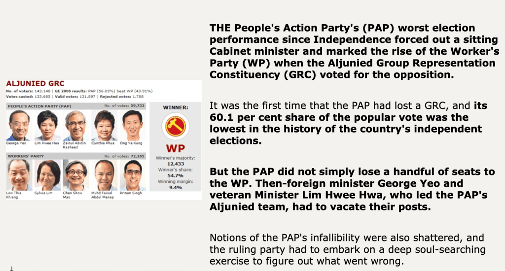 In the past, the PAP party won elections by 80%-90% of the votes, until 2011 when the vote for the PAP party dropped to 60%, causing the party and government to rebuild trust with the citizens and to show their acknowledgement that the previous way of governing needed to be changed to enable the citizens to give their feedback to the government in more ways than by elections alone, as described in the following two slides.