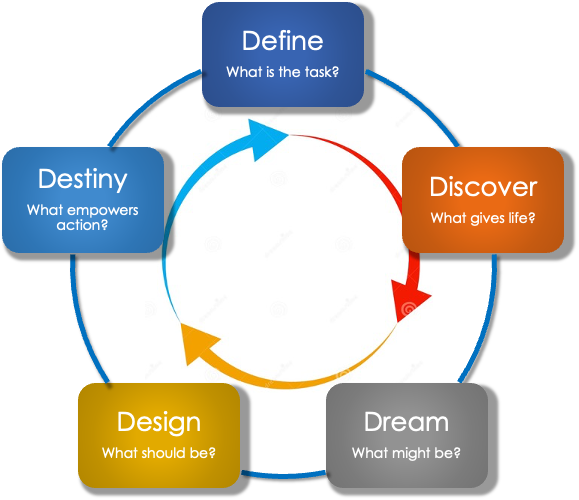 The 5-D Cycle has 5 generative questions that can be used to guide a conversation between two people, a team, or entire organization. It can serve as a framework for personal/professional development or coaching.